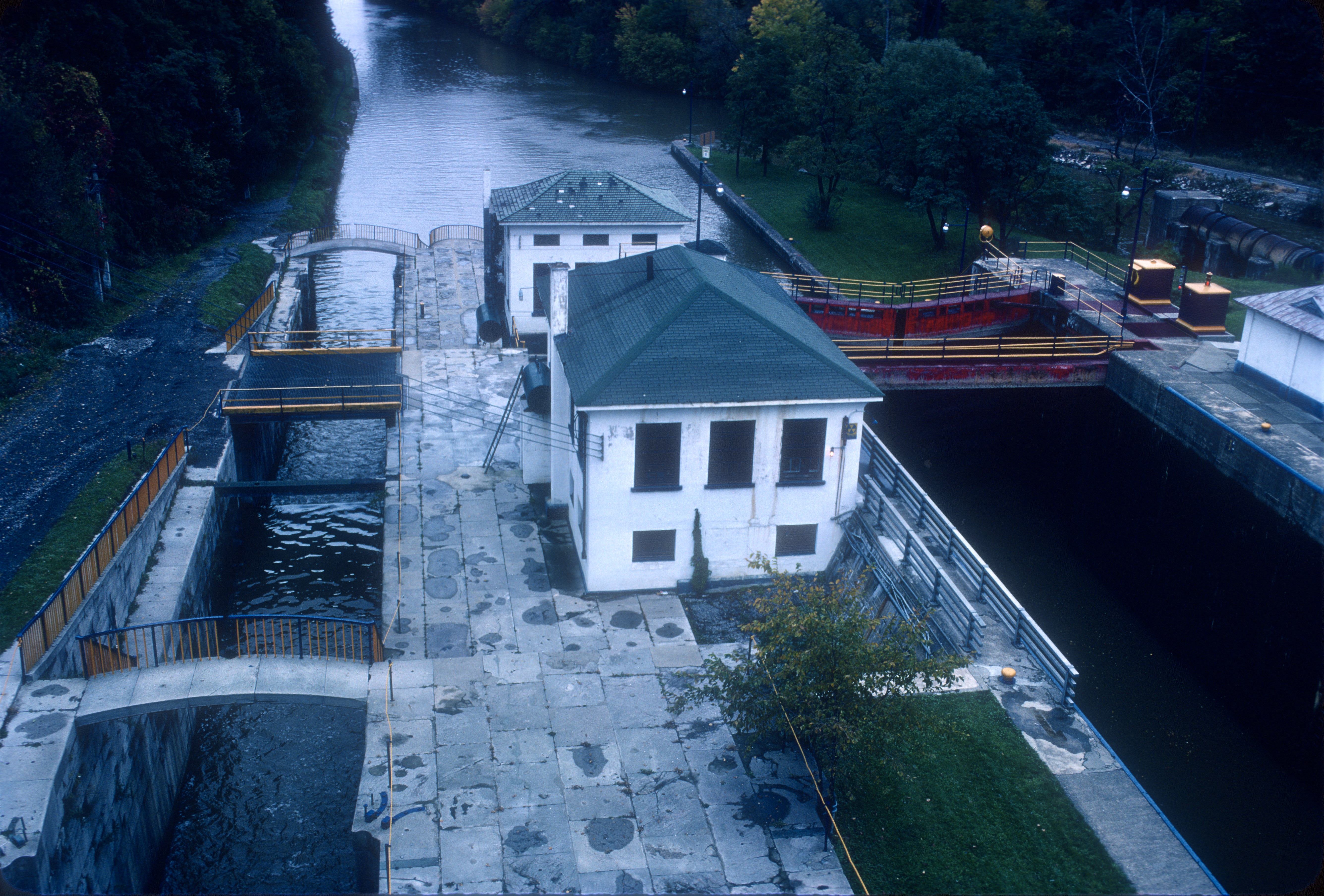 The old and new locks on the Erie Canal at Lockport, New York. The locks were built in 1850 and 1915, respectively.