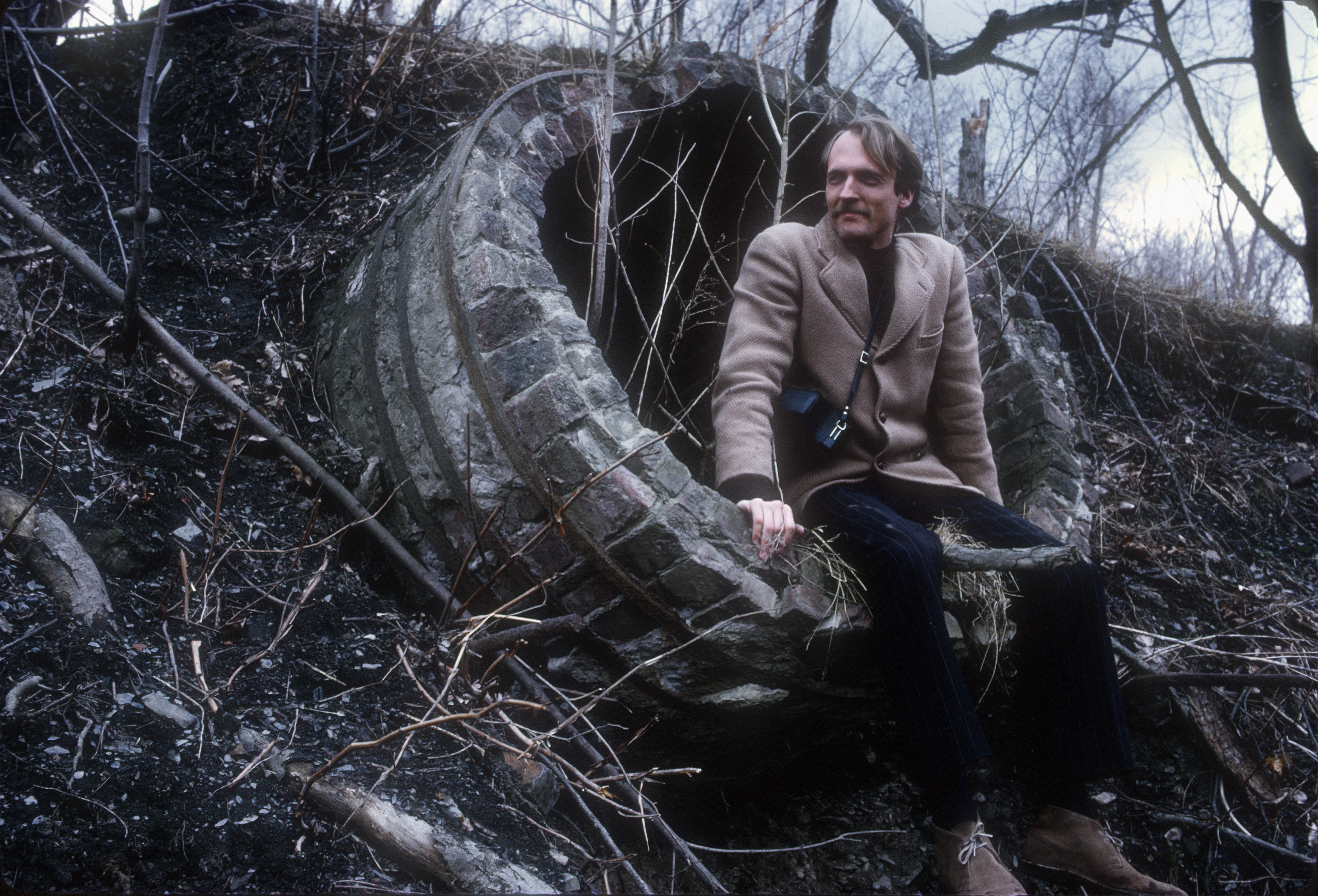 The Burden Waterwheel with Eric DeLony sitting on the penstock ruins.