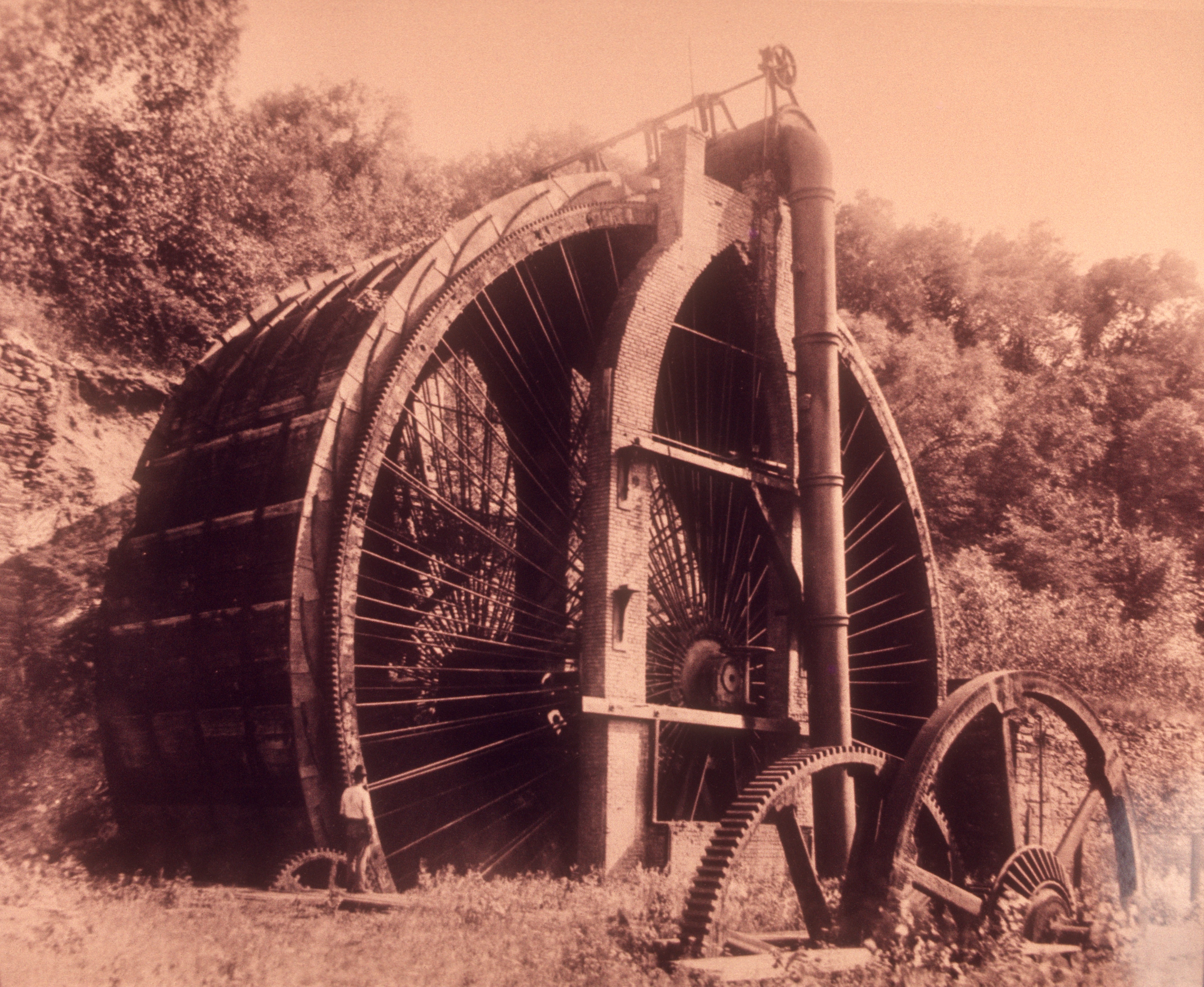This is a a historic image of the Burden Waterwheel c. 1900. Most likely between 1899 and 1914 when the pier collapsed.
