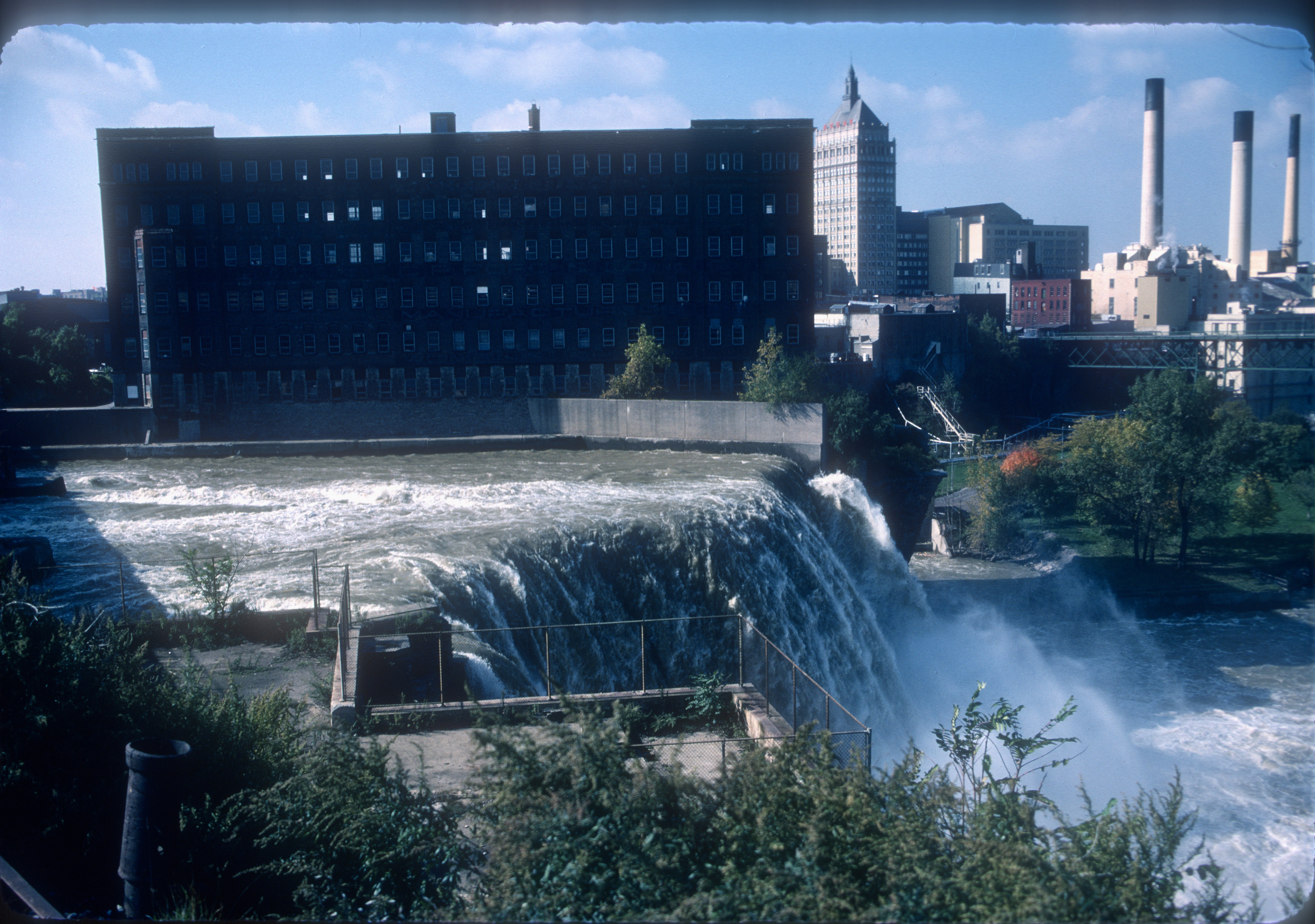 High Falls on the Genesee River in Rochester, New York. In the background is the Pont de Rennes Bridge (formerly called the Platt Street Bridge).