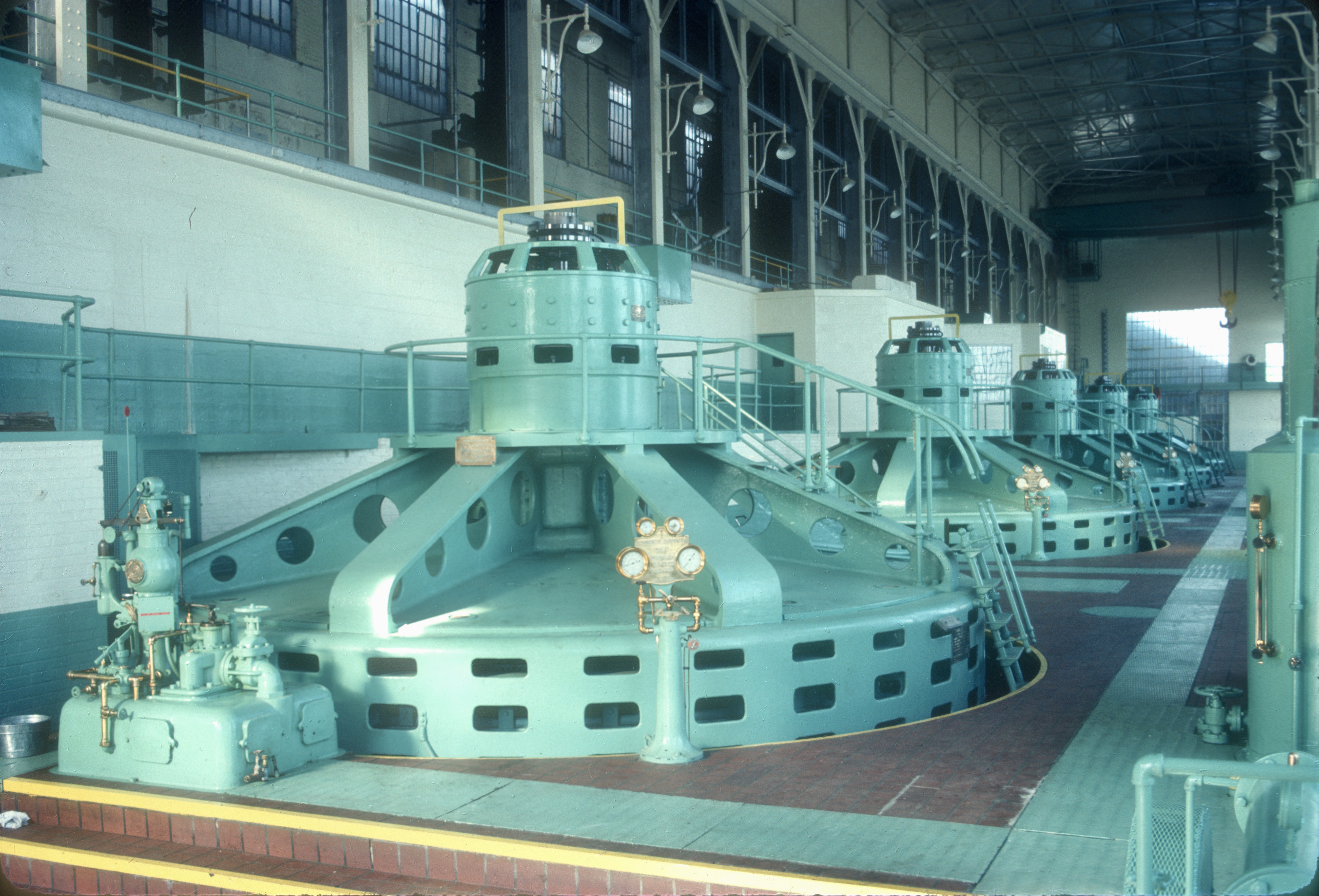 The generators at the Fishing Creek Hydrostation on the Catawba River in Great Falls, South Carolina, built c. 1916.