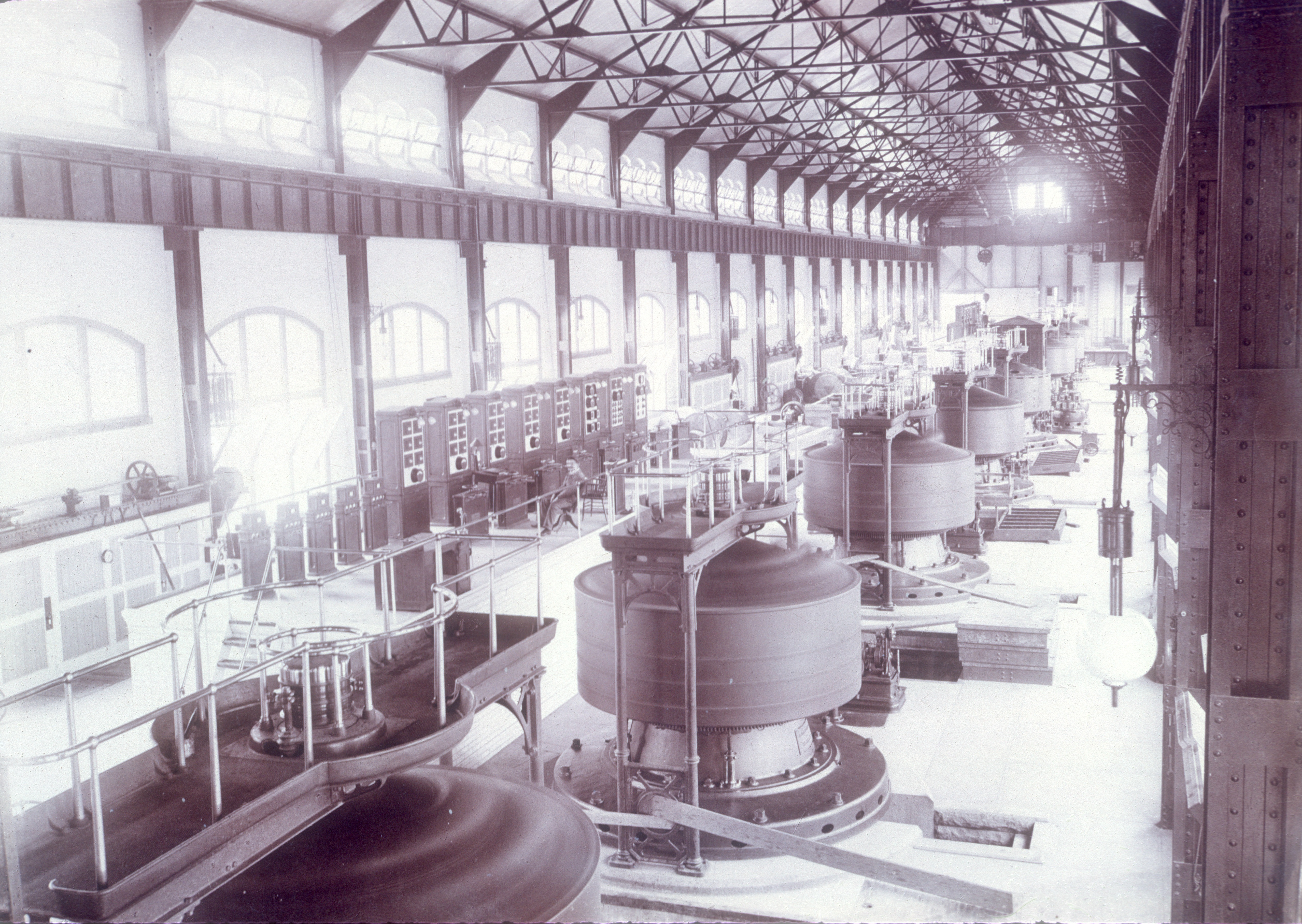 This is a historic photo of the interior of the Edward Dean Adams Power Plant in Niagara Falls, New York.