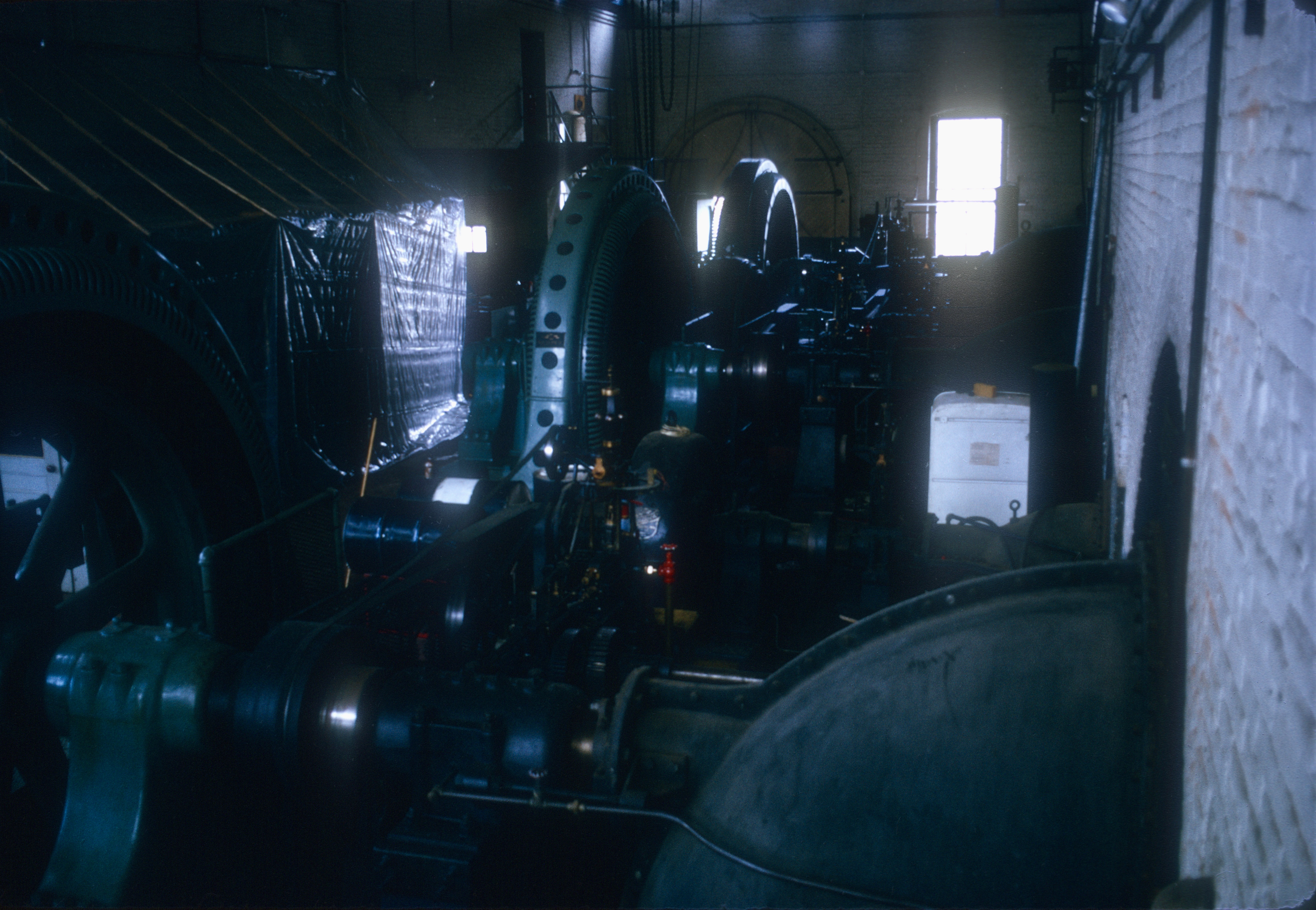 The generators (manufactured c. 1920) at Turners Falls Hydroelectric Station No. 1, built in 1892, on the Connecticut River in Turners Falls, Massachusetts.