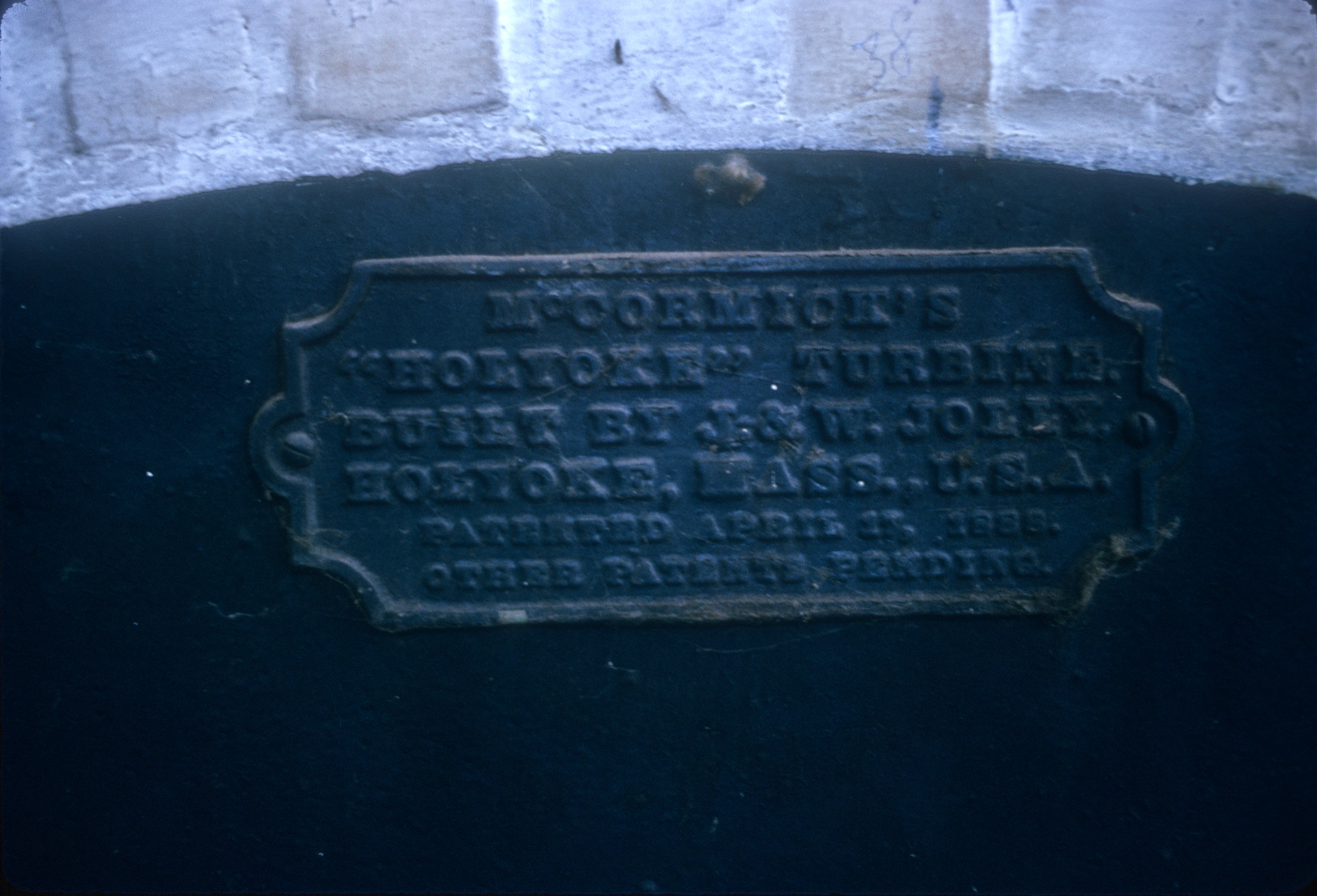 The Jolly turbine nameplate at Turners Falls Hydroelectric Station No. 1, built in 1892, on the Connecticut River in Turners Falls, Massachusetts.